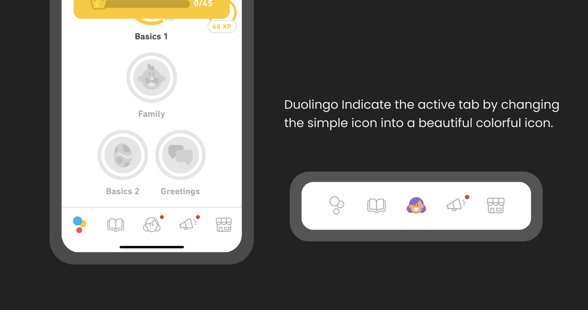 Duolingo把图标变成彩色,来显示目前用户在哪个标签。