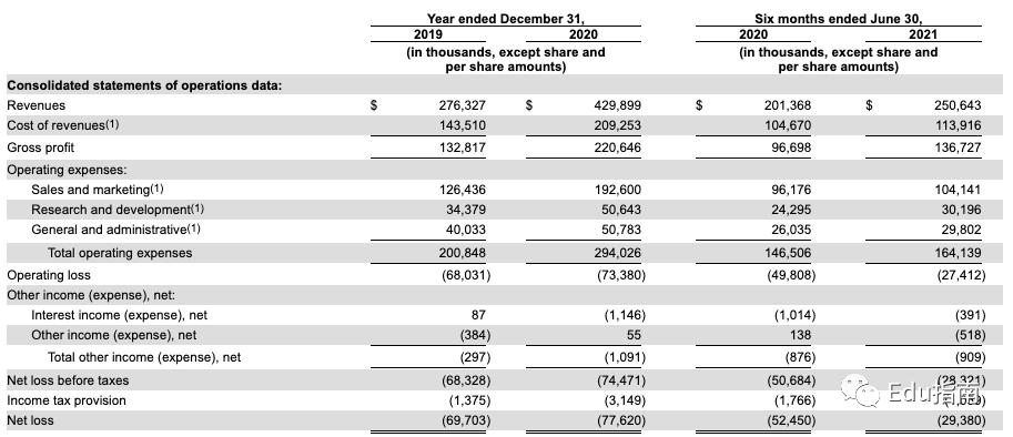 收入方面,根据Udemy报告,2019 年至 2020 年期间,Udemy 的收入从 2.763 亿美元增加到 4.299 亿美元,增长了 55.6%。这意味着疫情时期该公司仍保持较快的收入增速。