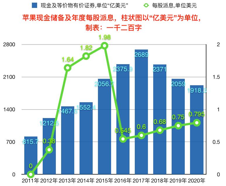 这里的图表根据苹果以往10-K年报,梳理出从2011年至2020年该公司现金、现金等价物及有价证券的年底规模,从2011年的800多亿美元增加到2020年的2000亿美元,中间2017年曾高达2700亿美元。要知道,大国用于刺激经济、宏观调控时向市场注入的资金也不过如此。