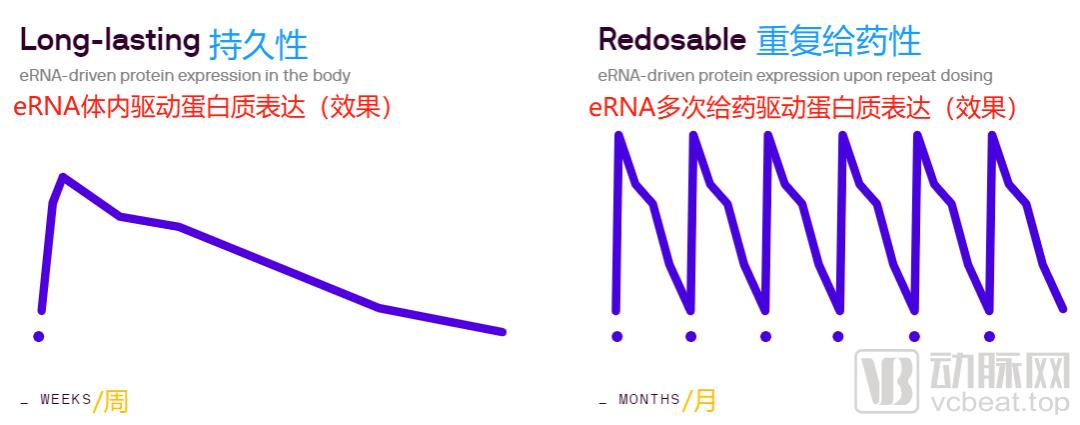 同时,由于eRNA™本身属性的优势,这种药物作用更加持久、低免疫原性,且允许重复给药、递送方式灵活。从Laronde官网可以看到(如下图),由eRNA驱动的体内蛋白的表达能稳定持续一周以上(而线性RNA表达一般只能维持几天),同样重复给药eRNA也不会影响蛋白质持续表达的效果。