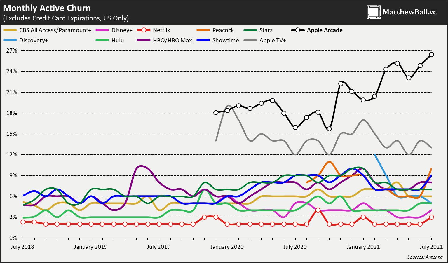然而,最能说明问题的是Arcade的流失率。每个月大约有20%的用户离开该服务(意味着平均使用时间只有5个月)。这是表现最差的订阅视频服务的3.5倍。事实上,在《权力的游戏》大结局后的一个月里,苹果Arcade的用户流失率是HBO的两倍多......但每个月都是如此。请注意,Netflix的流失率在同类产品中是最好的,有一定的优势。