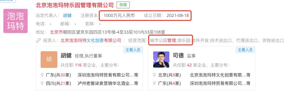 2021年3月,泡泡玛特CEO王宁曾在分析师会议上表示,公司计划逐步发展主题公园以及内容业务;8月,由泡泡玛特全资控股的北京泡泡玛特乐园管理有限公司成立,注册资本1000万元,经营范围包含城市公园管理、游乐园、演出场所经营等。