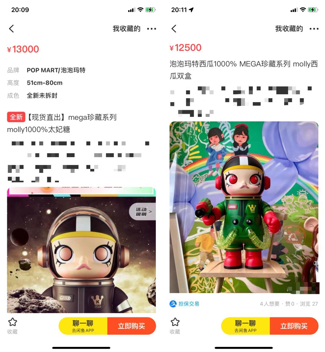 与此同时,泡泡玛特 过度的消费“ Molly”,严重的依赖单一IP 。 推出同款“变大”的盲盒玩具,并且以限量版进行销售: 据泡泡玛 特官方数据,今年8月中旬推出的Space Molly西瓜和太妃糖两款大娃,仅在天猫一家平台,就有超过98万人参与产品抽签。 这种销售策略可以说相当成功,大娃的二手价格甚至被追捧到数万元。