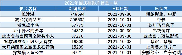 放眼今年国庆档,除8部影片确定“国庆档”上映外,还有数部经典电影重映,除了《长津湖》以及“我和我的”系列第三部《我和我的父辈》两部献礼片外,还包括真人儿童影片《皮皮鲁与鲁西西之罐头小人》和五部动画电影,以及青春片《五个扑水的少年》。