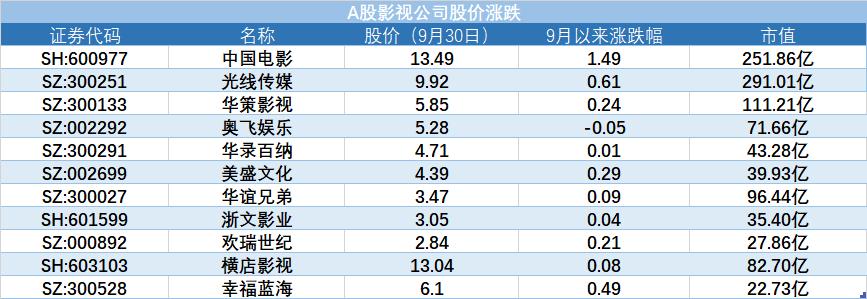 根据证券时报·数据宝统计,节前一日,12家影视院线上市公司中有10家股价涨幅录得正值,幸福蓝海和《长津湖》出品方之一的上海电影涨超5%。受益于国庆档的利好窗口,这些影视院线上市公司的股价自9月以来平均上涨4.02%,跑赢大盘近3.5个百分点,上海电影和中国电影的累计涨幅超过10%。