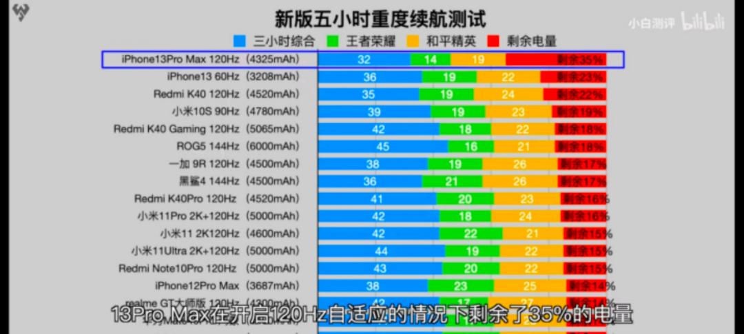 再说说充电和续航,iPhone 13系列的电池容量有所上涨,在续航上有了较大提升。据测评博主“小白测评”的五小时中重度续航测试显示,iPhone 13 Pro Max剩余电量35%,位列第一,高于红米 K40和小米 10S。