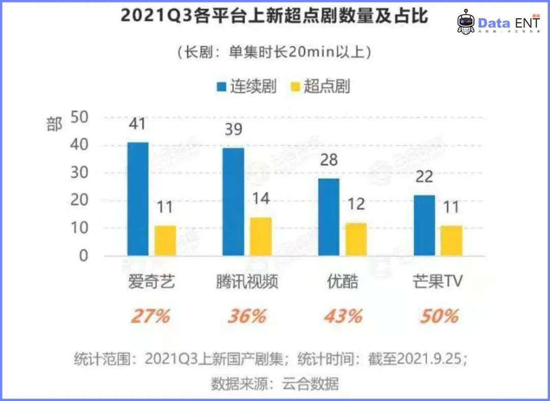 平台方面,21年Q3爱腾优芒超点剧均为10余部。其中,爱奇艺超点剧占比最低,为27%;腾讯视频、优酷均在40%上下;芒果TV超点剧占比达50%。