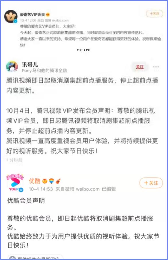 其中爱奇艺同时取消会员可见的内容宣传贴片,腾讯视频方面则停止超前点播内容更新,优酷取消超前点播服务。