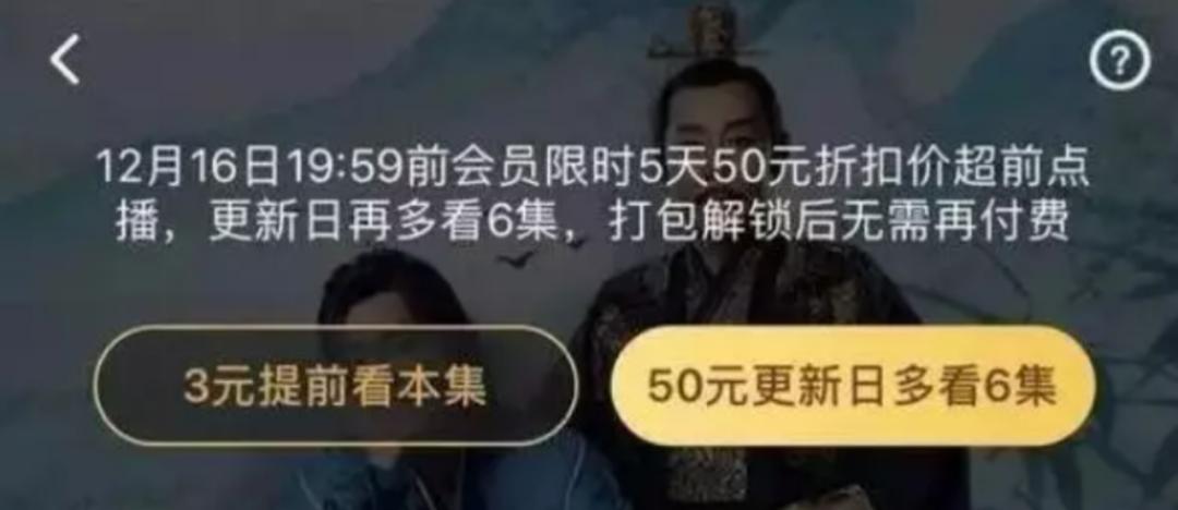 2019年11月,热款爆剧《庆余年》凭借前期精彩的情节吸引了大批受众,12月11日,总体量46集还没播到一半,两个视频平台便联手推出“超前点播”模式——