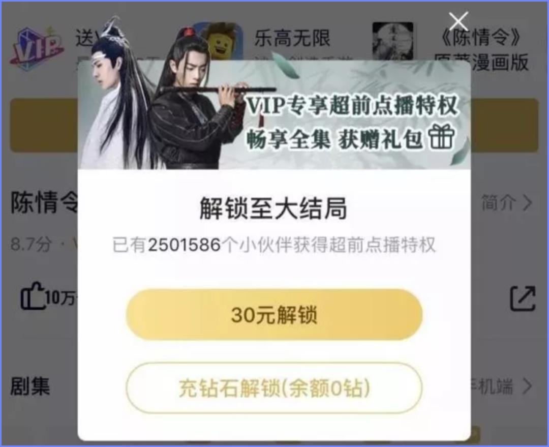 2019年6月,《陈情令》开创付费提前解锁大结局模式,给腾讯平台一夜带来了7600万的收入。这个可观的收入,让平台看到了曙光。