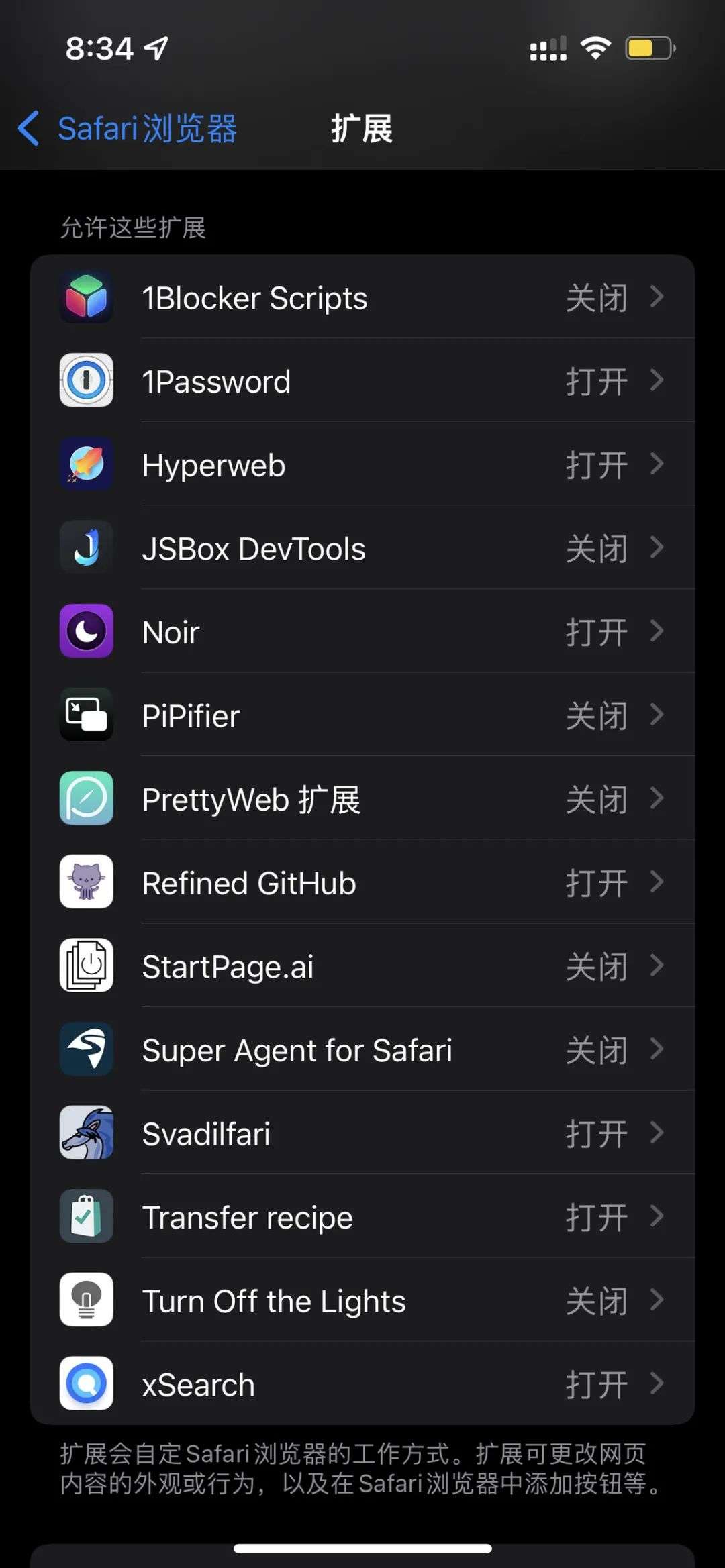 此外,你也可以在「设置-Safari 浏览器-扩展」中对不同插件的开关和权限进行选择。