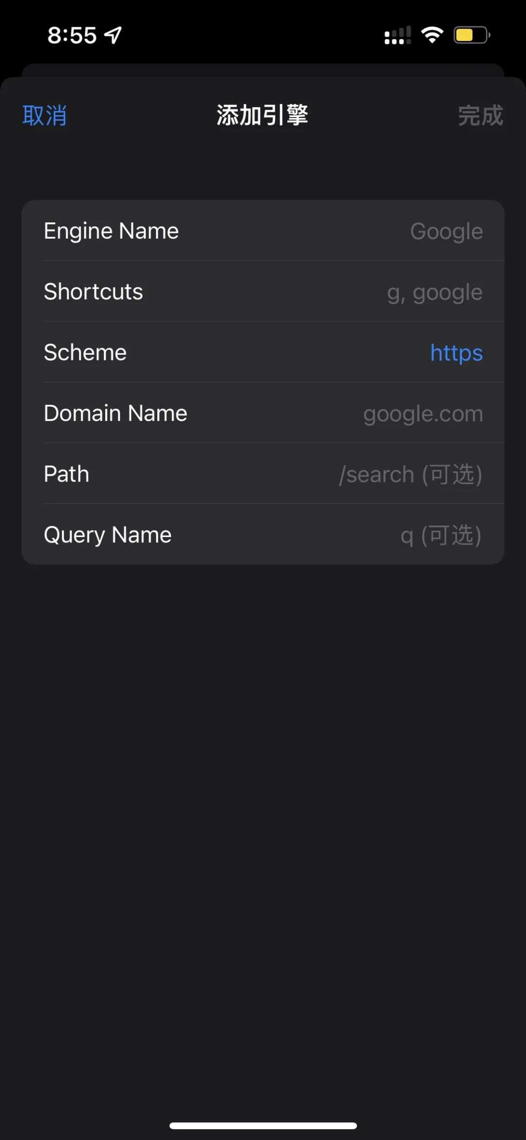 此外,你也可以使用第二个图标,分别输入搜索引擎的域名(Domain Name)、路径(Path)和检索名称(Query Name)来完成设置。 对于少数派来说,这三部分分别为「sspai.com」「search/article」和「q」。