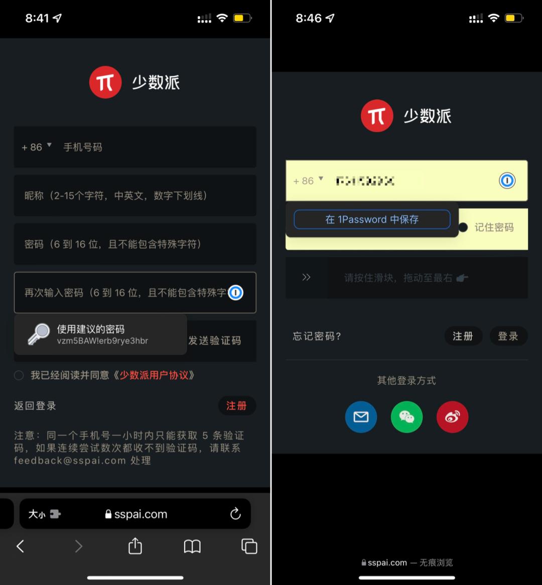 在开启扩展后,当你在网页上进行注册时,1Password 会在下方提供「在 1Password 中保存」的选项,从而让你可以更为便捷地将账户信息添加至 1Password 中;而在输入登录信息后,1Password 还会询问是否将当前的登录信息保存至 App 中,从而避免了在 App 中手动输入相关内容的麻烦。