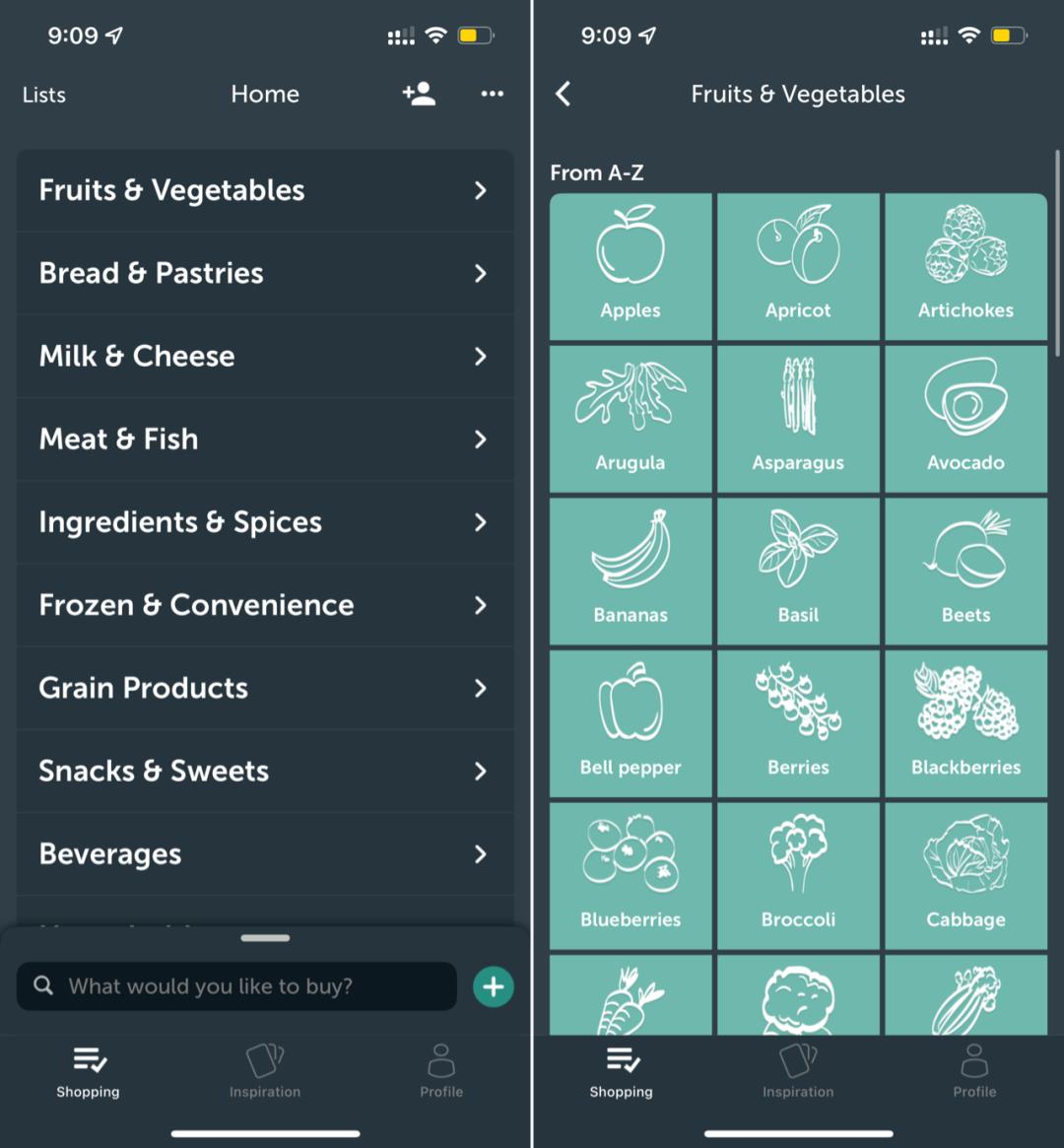 Bring! 是一款日用品管理工具。在 App 的主页面,Bring! 提供了果蔬、糕点、奶制品、洗化品、宠物用品等一系列的食材、杂货与日用品预设,并在每一栏目下罗列了详尽的商品种类。