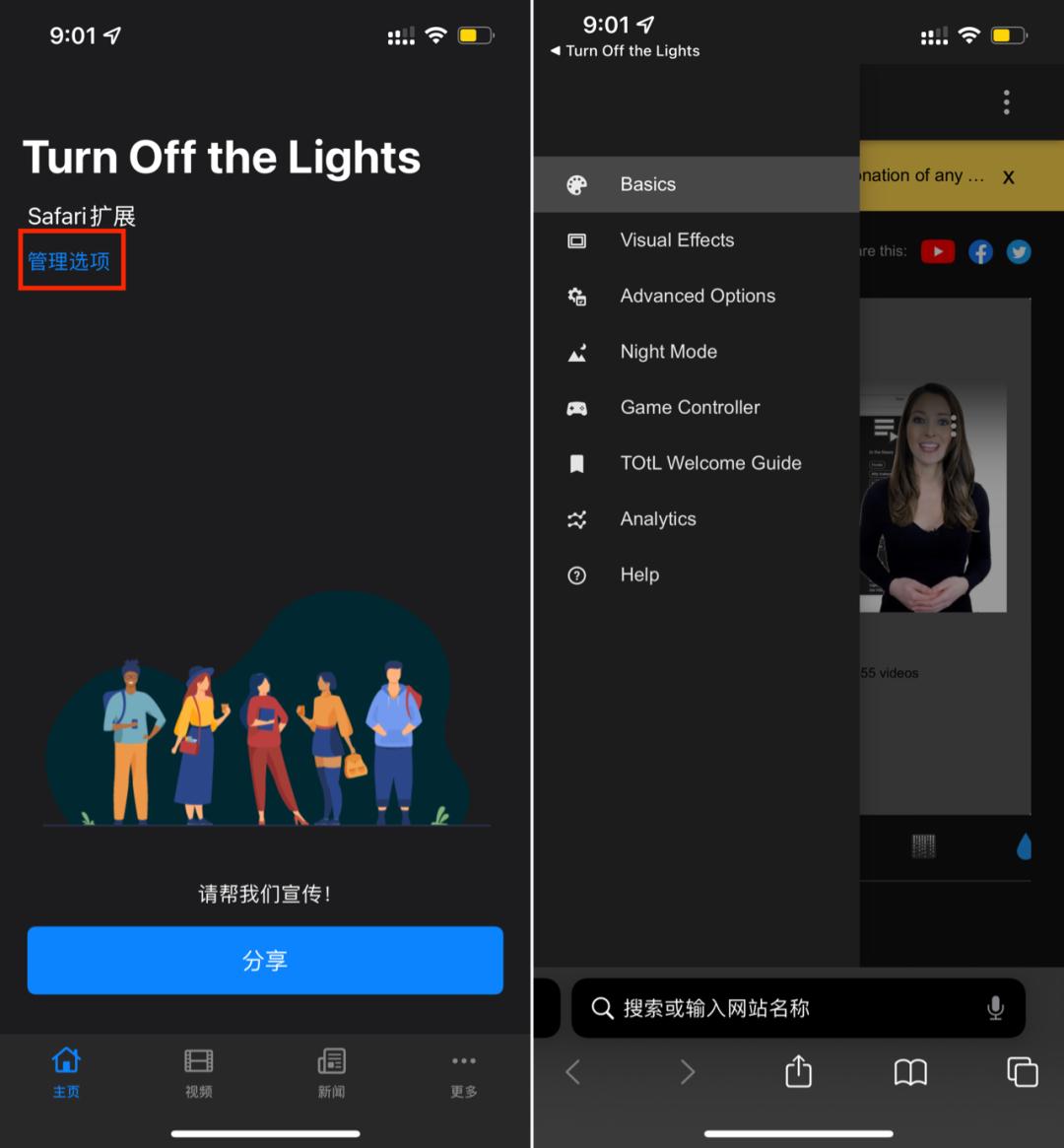 相较于 Noir,Turn Off the Light 为用户提供了更大的自由度。在开启扩展后,通过在应用内点击「管理选项」,即可在跳转后的页面中对扩展效果进行调整。点击左上角的菜单键后,你可以对全局暗色模式、部分视频播放等进行详细的设置。
