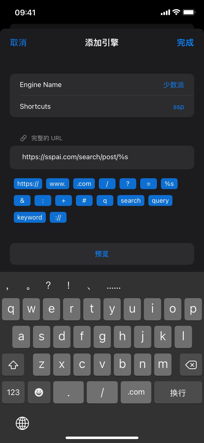 以少数派为例,站内的搜索 URL 为https://sspai.com/search/post/ %s 。你可以点击应用右上角的第一个图标,输入自定的搜索引擎命名和使用关键词,并将 URL 粘贴至对应位置,就完成了一次设置。
