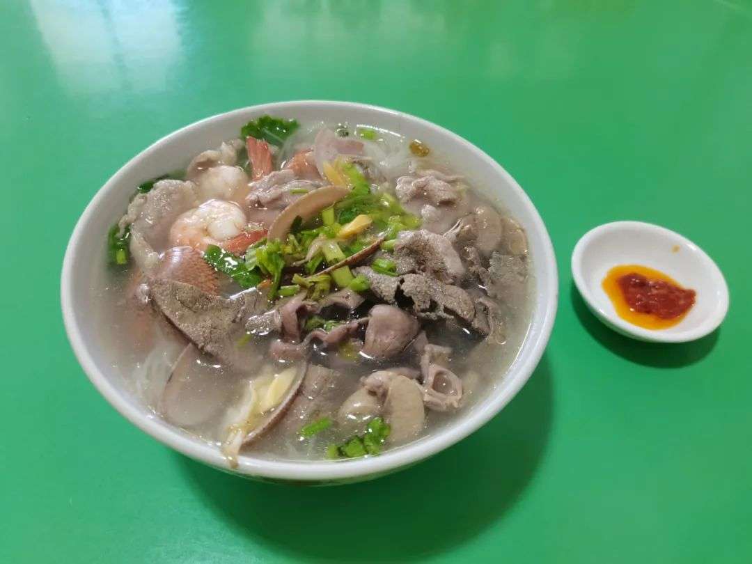 中午在市区吃了一碗15元的猪杂米粉,说是猪杂却还放了3根虾和5个贝。