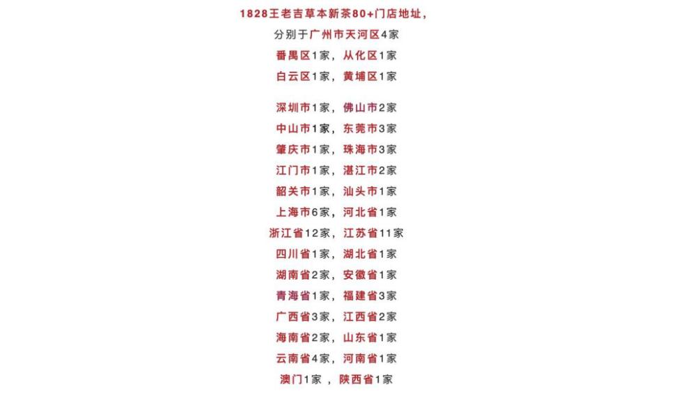 从1828王老吉草本新茶的官方微信公众号,目前共有80+门店地址。刘奎透露,关店潮是从年后开始,每月都有5-6家关店。他所知道的,就有二三十家,“现在应该过半了。”