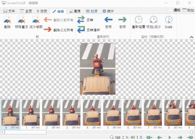 录制完成的文件会自动进入编辑器供你处理。若想要减少 GIF 文件体积,除编辑器下方时间轴可帮助删减当前帧外,「编辑」选项卡下提供了根据相似度移除重复帧以及「隔 X 帧删除一帧」的工具。