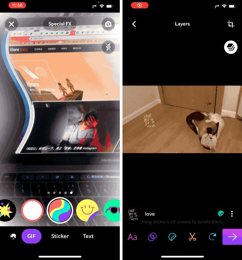 进入制作后出现的是相机录制界面,可以一边录下小猫咪舔爪子的可爱模样,还可以一边为其增加别的动画效果——只需划动屏幕中间圆形图标即可切换特效。