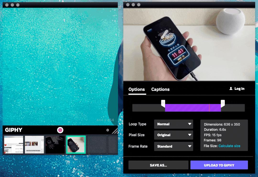 绿色的选框代表着录制范围,点击下方录制按钮即可开始录制,再次点击该按钮完成录制后,GIF 图会在绿色框最下方显示缩略图。点击该缩略图就进入了编辑保存界面。和 GIPHY logo 如出一辙的色彩风格是那显眼的紫色,它代表着 GIF 图的时间轴,拖拽两端箭头图标就可以调整 GIF 图的时长。