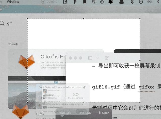 录制过程中它会识别你进行的操作,比如鼠标点击、键盘输入等,很适合用作演示。除此之外,Gifox 还提供录制窗口吸附功能,打开 Gifox 后点击界面左上角窗口图标唤出 start window selection 即可选择所吸附的窗口开始录制。