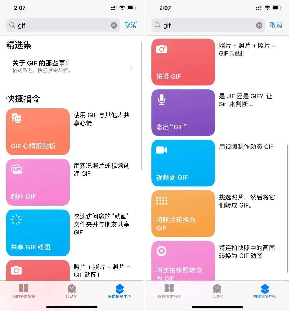 打开 iOS 的《快捷指令》,并进入「快捷指令中心」搜索「GIF」,你将收获一大批创建 GIF 的脚本。