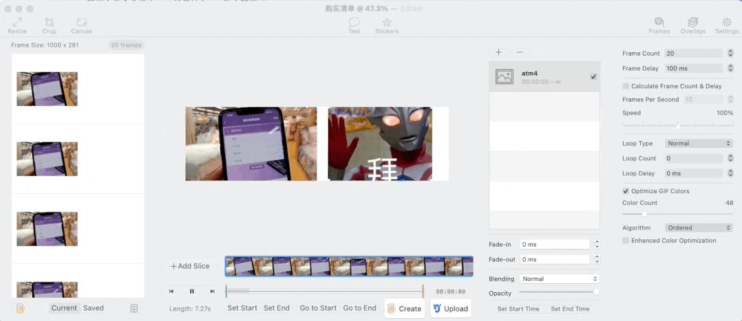 只需在 Canvas 中选择画布大小,再点击 Overlays 添加相关图片(上图中为奥特曼),Overlays 模式下可添加文本、贴纸、静态图或另一张 GIF 图。