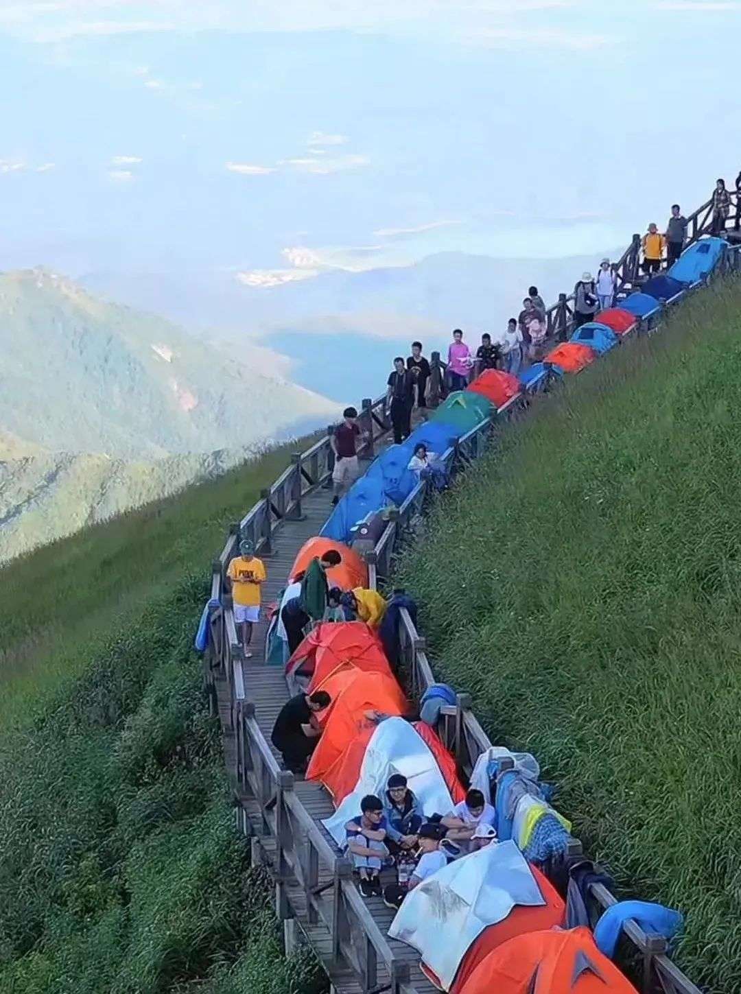 10月2日,舟车劳顿的刘灿和朋友到达武功山景区,首先震惊他的不是惊艳的自然景观,而是眼前的人山人海 。排了1个多小时才坐上了接驳大巴的刘灿,内心还有一丝侥幸,也许到了山上,人就少了? 经过两趟缆车,外加一段段并不轻松的徒步跋涉,刘灿在天黑到达山顶露营地点,此刻这里的帐篷已经“摩肩接踵”,他高价租到一顶旧帐篷时,山顶浓雾升起,气温骤降。