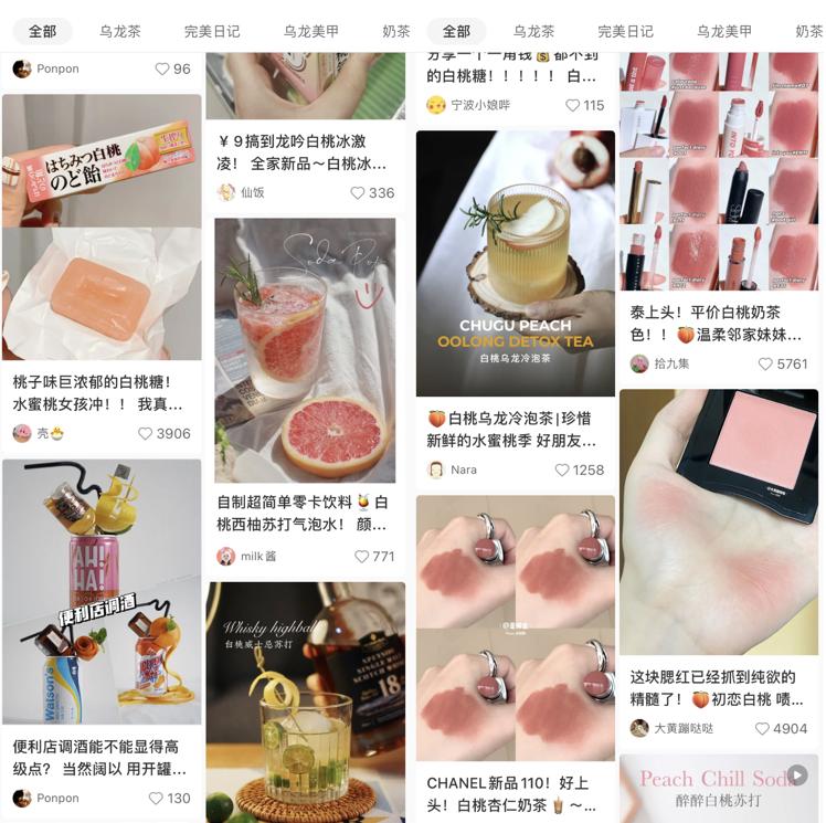 小红书上搜索“白桃”有35万+篇笔记,除了白桃味的乳饮、酒、冰淇淋等,还有白桃色的口红、沐浴露、指甲油等美妆个护产品。