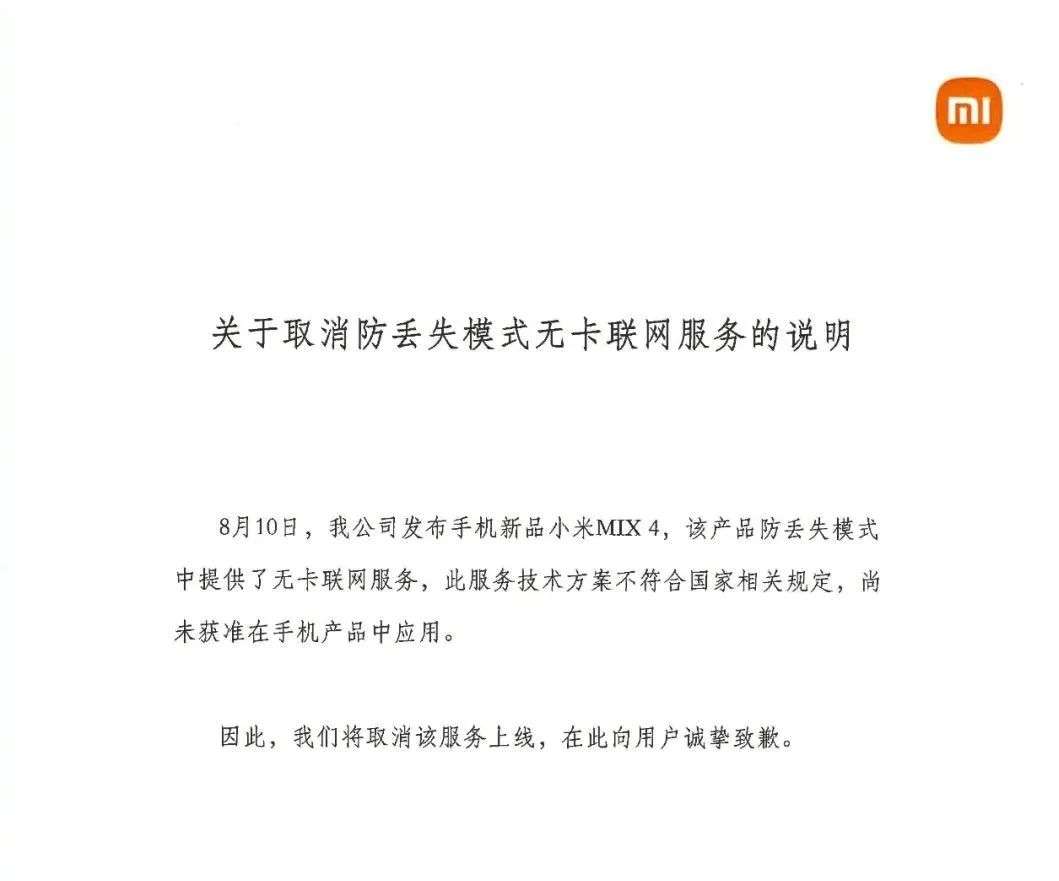 但遗憾的是,这项对用户相当友好的功能并未存活太久,在MIX 4发售不足一周时,小米在微博上发布声明称:小米MIX 4的防丢失模式中提供了无卡联网服务,此服务技术方案不符合国家相关规定,尚未获准在手机产品中应用,因此小米将取消该服务上线,并向用户诚挚致歉。
