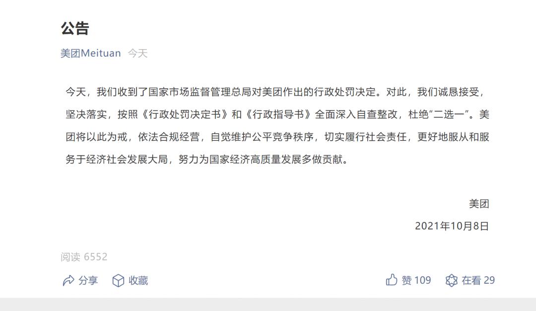 已收到国家市场监督管理总局对美团作出的行政处罚决定。对此,我们诚恳接受,坚决落实,按照《行政处罚决定书》和《行政指导书》全面深入自查整改,杜绝「二选一」。