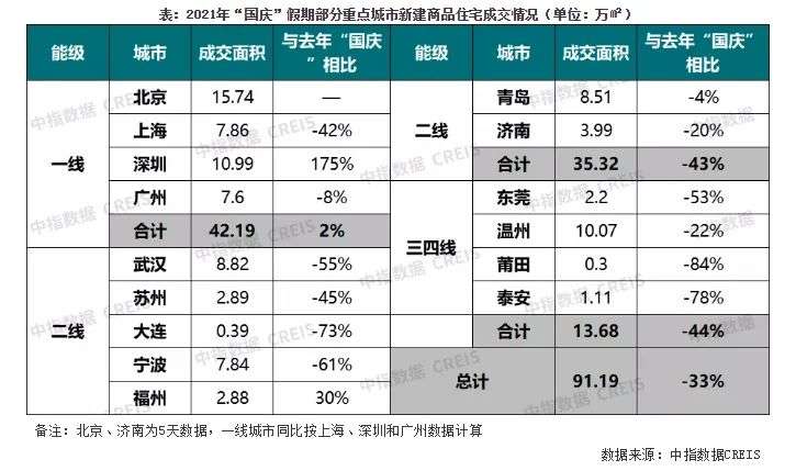 该机构称,国庆假期期间,4个一线城市新建商品住宅累计成交42.19万平方米,与去年同期基本持平;二线代表城市新建商品住宅累计成交35.32万平方米,同比下降43%;三四线代表城市新建商品住宅累计成交13.68万平方米,同比下降44%。