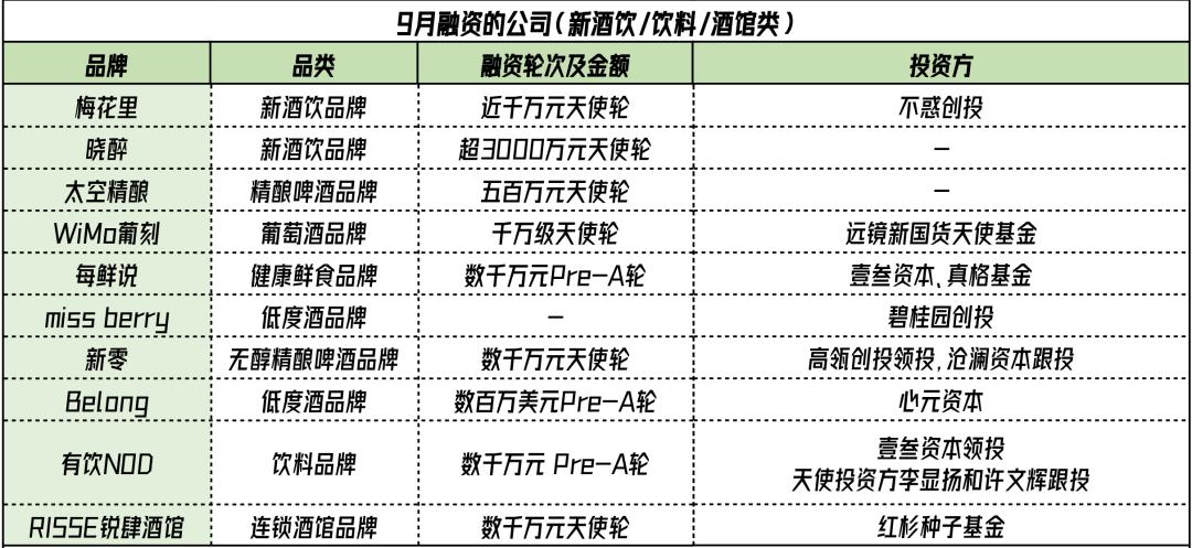 整个九月,依然有包括Miss Berry、Belong、梅花里、晓醉等低度酒品牌,以及太空精酿和新零等精酿啤酒品牌拿到融资。