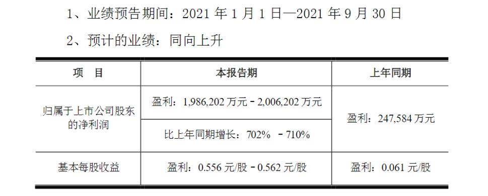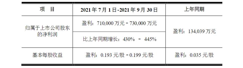 其中,第三季度归属于上市公司股东的净利润71亿元-73亿元,同比增长430%-445%。