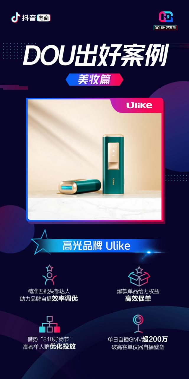 韩国知名品牌Ulike率先将韩国医美级冰点脱毛科技家用化,连续5年获得脱毛仪行业销量第一,Ulike早就发现中国市场存在的巨大潜力,旗下的两大研发中心之一便坐落于中国深圳。抖音818新潮好物节期间,Ulike邀请达人钱疯疯进入直播间,仅8月17日,品牌自播GMV便超200万,突破高客单仪器壁垒。