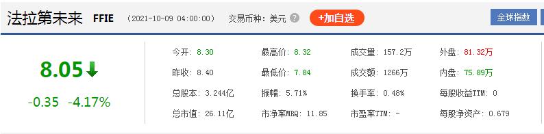 法拉第未来于7月22日在纳斯达克上市,股票代码为FFIE,发行价为13.78美元/股,一度股价涨为16.8美元,截止10月9日,股价跌为8.05美元/股,三个月不到下跌了42%。
