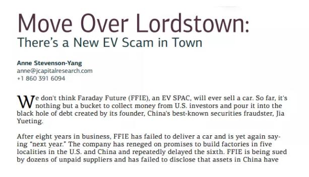 但这一消息被 J Capital Research考证为虚假消息,做空报告指出要量产FF汽车的汉福德工厂现在基本没有开动,并且有工程问题没有解决,这些现实问题意味着FF在短期依然无法开工。