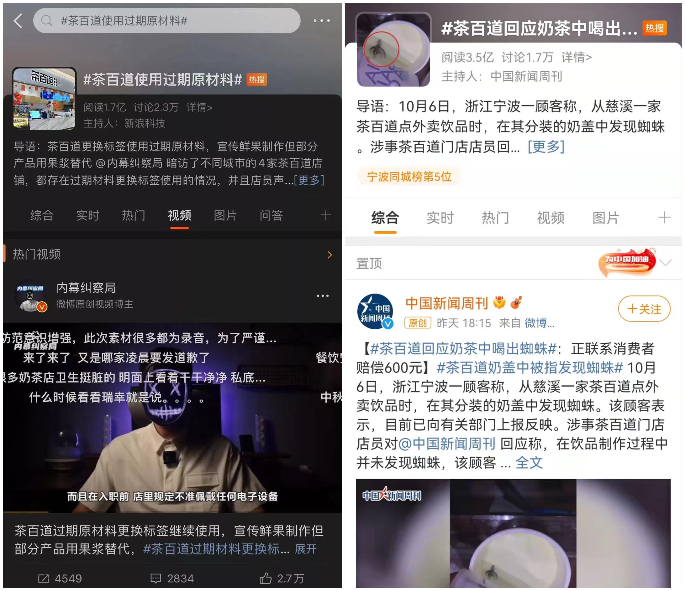 因食品安全问题,茶百道一周两次上热搜,被全网骂。