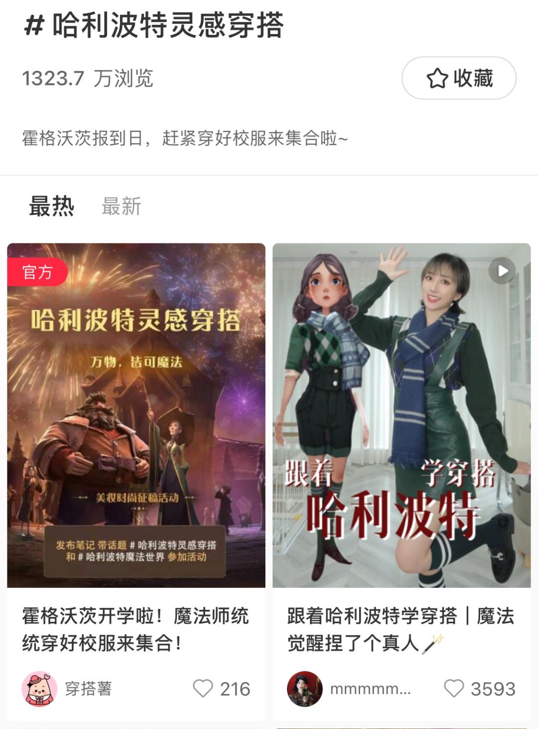 除了玩家用户自发的内容之外,官方项目组也会针对平台属性,围绕其用户画像发起更有针对性的话题, 例如发起话题#哈利波特灵感穿搭,通过鼓励用户化妆或者穿搭还原游戏角色的形式,激发内容创作和社交分享。