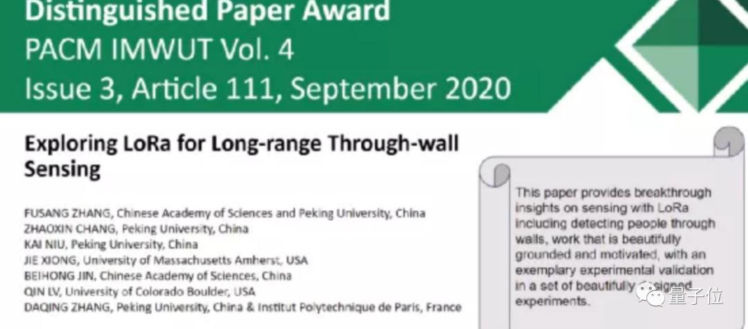 今年9月的ACM UbiComp 2021上,张大庆团队的「Exploring LoRa for Long-range Through-wall Sensing」论文,再次获得了杰出论文奖。