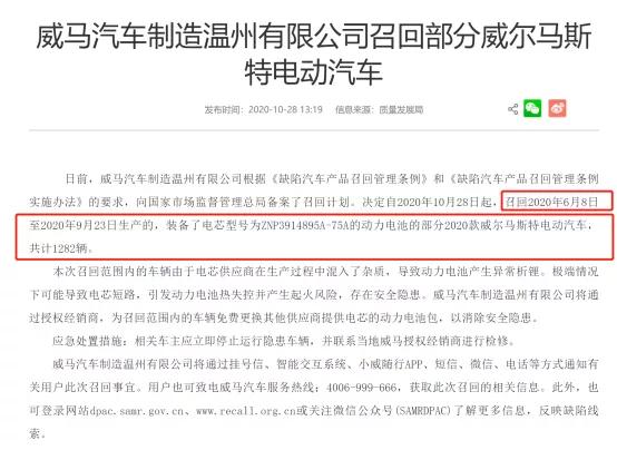 亏损难以摆脱,汽车质量问题,也是新能源造车绕不开的话题。从威马汽车来看,2020年9月23日至10月27日,北京、福建、浙江等地,威马汽车接连发生自燃事故,所幸未造成人员伤亡。2020年10月28日,威马汽车召回2020年6月8日至2020年9月23日生产的1282辆存在缺陷的汽车。这些被召回的汽车电池存在安全隐患,威马汽车免费为召回汽车更换电池。