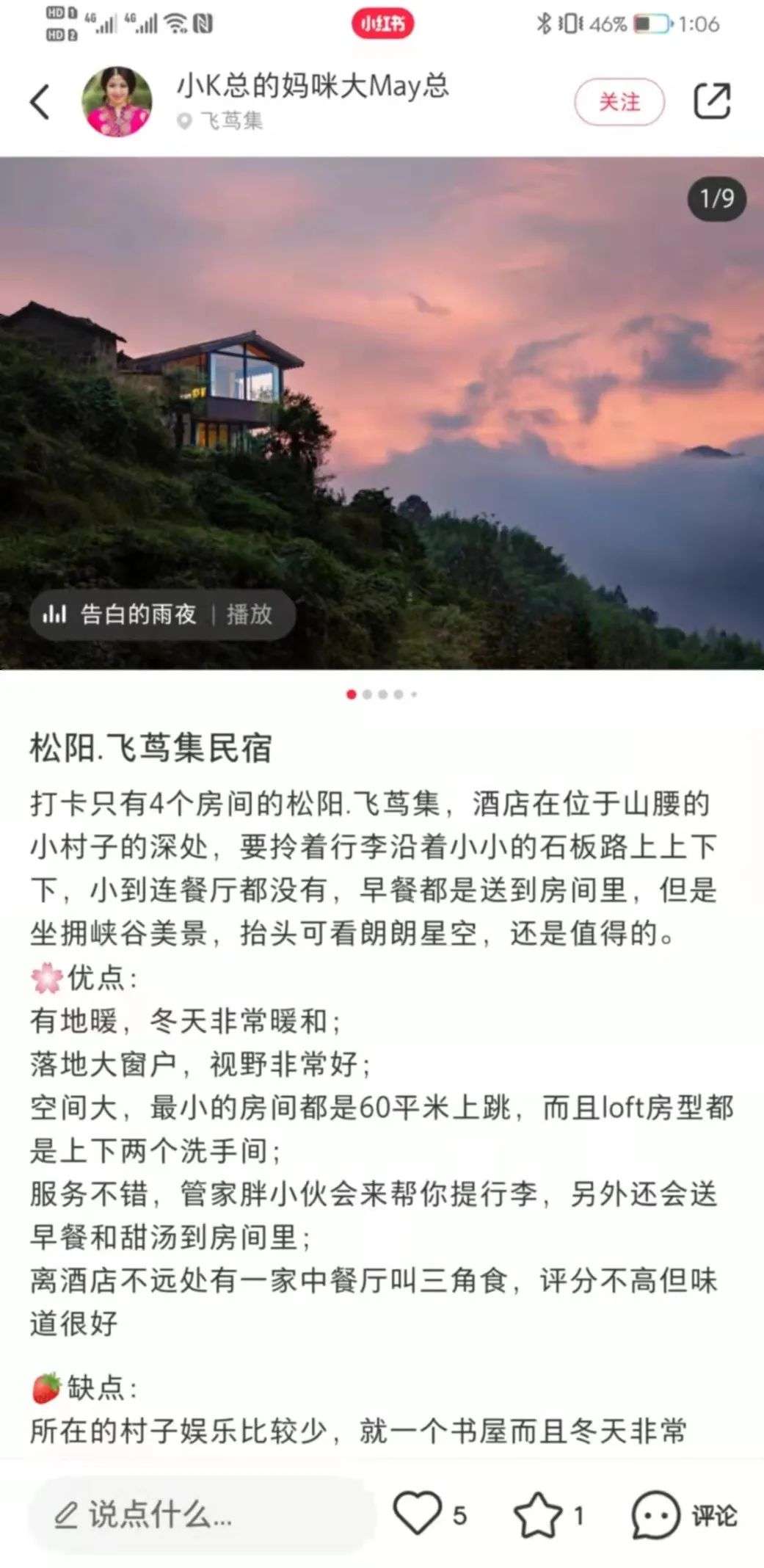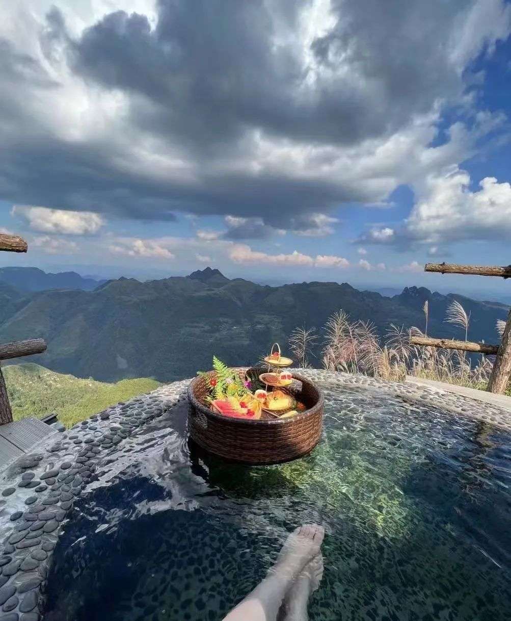 安安国庆期间来到了主打“野奢”体验的贵州黔南布依族苗族自治州“朴语野奢”,拥有山崖露天泡浴圆池的房型均价5500元一晚,提供摄影师旅拍和花草画手作,另外,她还在当地体验了苗族蜡染。九九则在国庆前几天入住均价1500元,位于松阳的高端民宿品牌“飞茑集”,陈赫前妻、网红旅行博主“蕾拉小姐”为联合创始人之一。