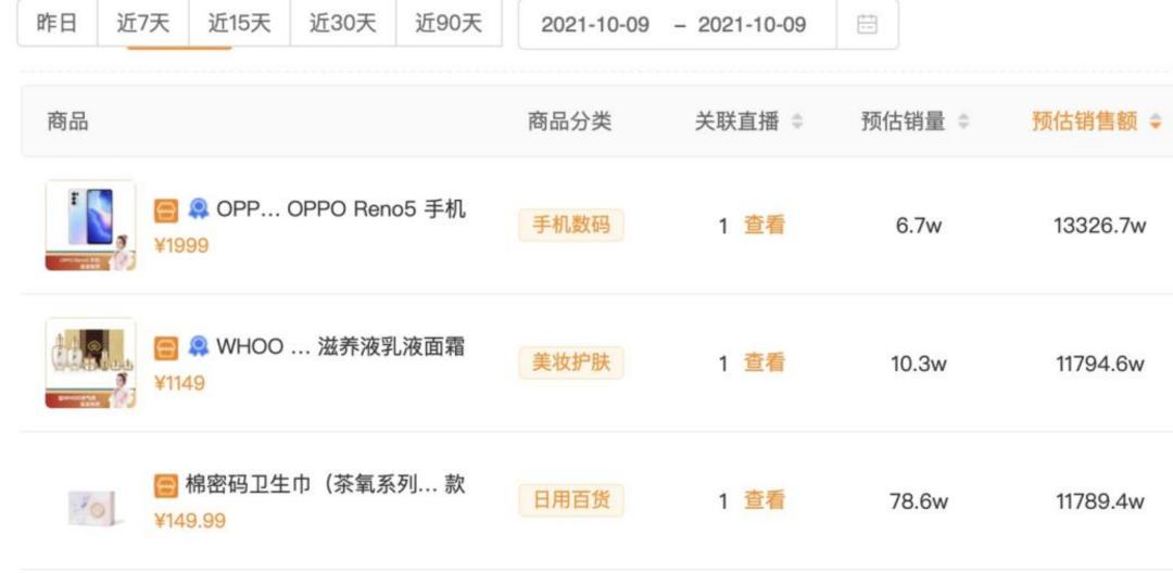 飞瓜数据显示,当日,蛋蛋共计带货49款,有6款产品GMV超3000万,单品GMV过亿的有3个。分别是GMV排名前三的OPPO Reno5手机,1.33亿;Whoo天气丹花献套盒,1.17亿;棉密码卫生巾套装,1.17亿。