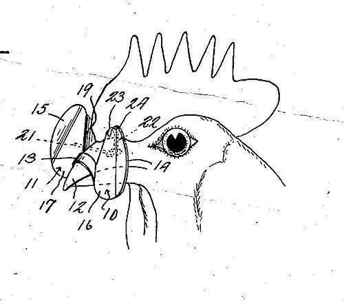 1902年,来自田纳西州的安德鲁·杰克逊二世(Andrew Jackson Jr.),开发了一种“鸡眼睛保护器”(Eye-Protector for Chickens),并为此申请了专利。