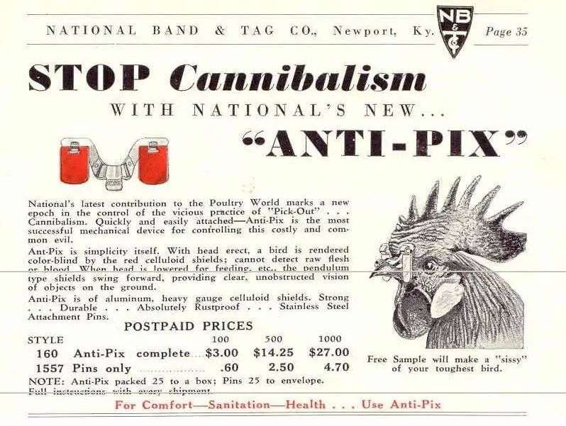 而今,养鸡人们常用的鸡眼罩又叫“无针偷窥器(pinless peeper)”。