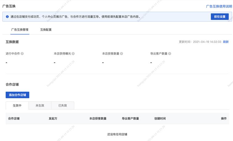 而「广告互换模式」是简单直接的跨店铺流量互换工具,应用于商城内的跨店广告投放。和“联合推广”不同,商家无需定向建联和重度运营,仅需要配置本店广告内容,以及店铺广告位,即可同时与多店铺进行广告互换,让本店广告在合作店铺内展示,实现便捷的流量互换。