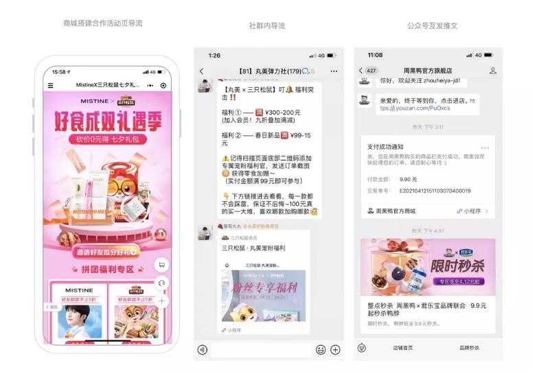 其中,通过有赞异业合作广场牵线,五芳斋与认养一头牛达成深度异业合作,实现全渠道流量互换获取新客,搭配有赞用户裂变工具,完成新的二次裂变,单日即达成2万私域用户新增;美妆品牌丸美与三只松鼠,通过直播、社群互推进行流量互换,同时借力有赞满减送营销工具,实现增量用户直购转化率提升33%,客单价超100元;除此之外,奶粉品牌金领冠与母婴用品戴可思达成合作,通过公众号联合推文、社群推广进行流量互换,实现新用户消费转化提升17%。
