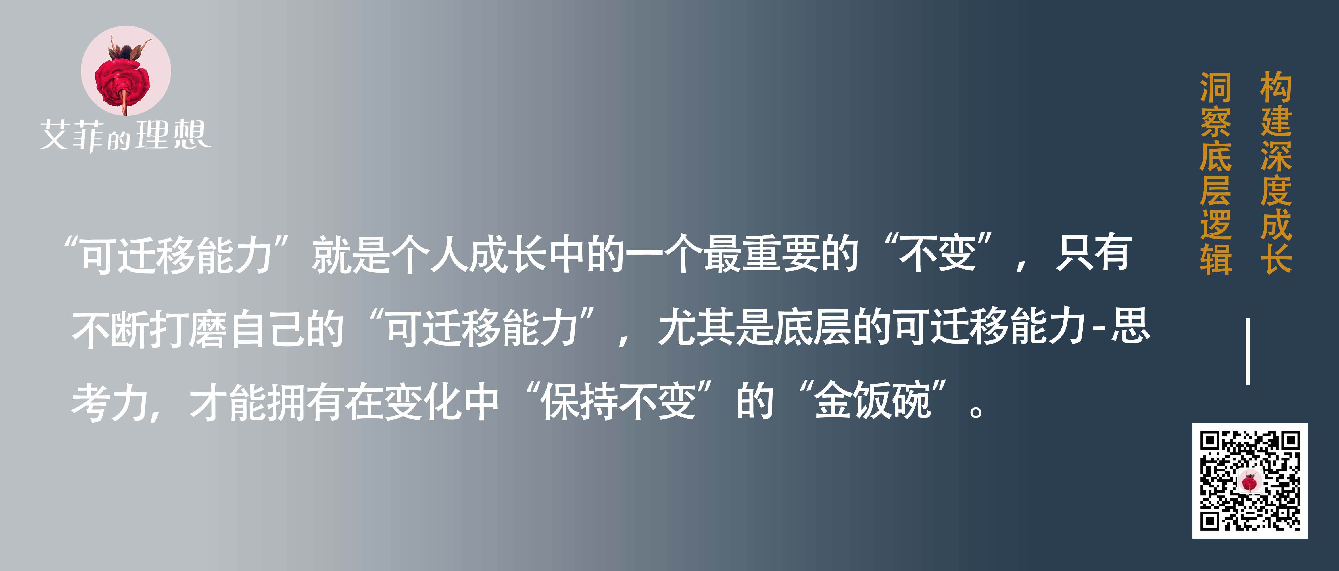 这就是个人成长中的一个最重要的“不变”,只有不断打磨自己的“可迁移能力”,尤其是底层的可迁移能力 - 思考力,才能拥有在变化中“保持不变”的“金饭碗”。