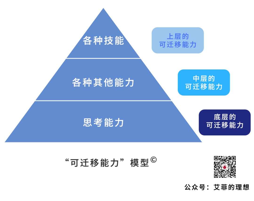 这就是“可迁移能力模型”,这一模型包括了三个层次:底层的可迁移能力是思考能力,中间层的可迁移能力是各种其他能力,上层的可迁移能力是技能。